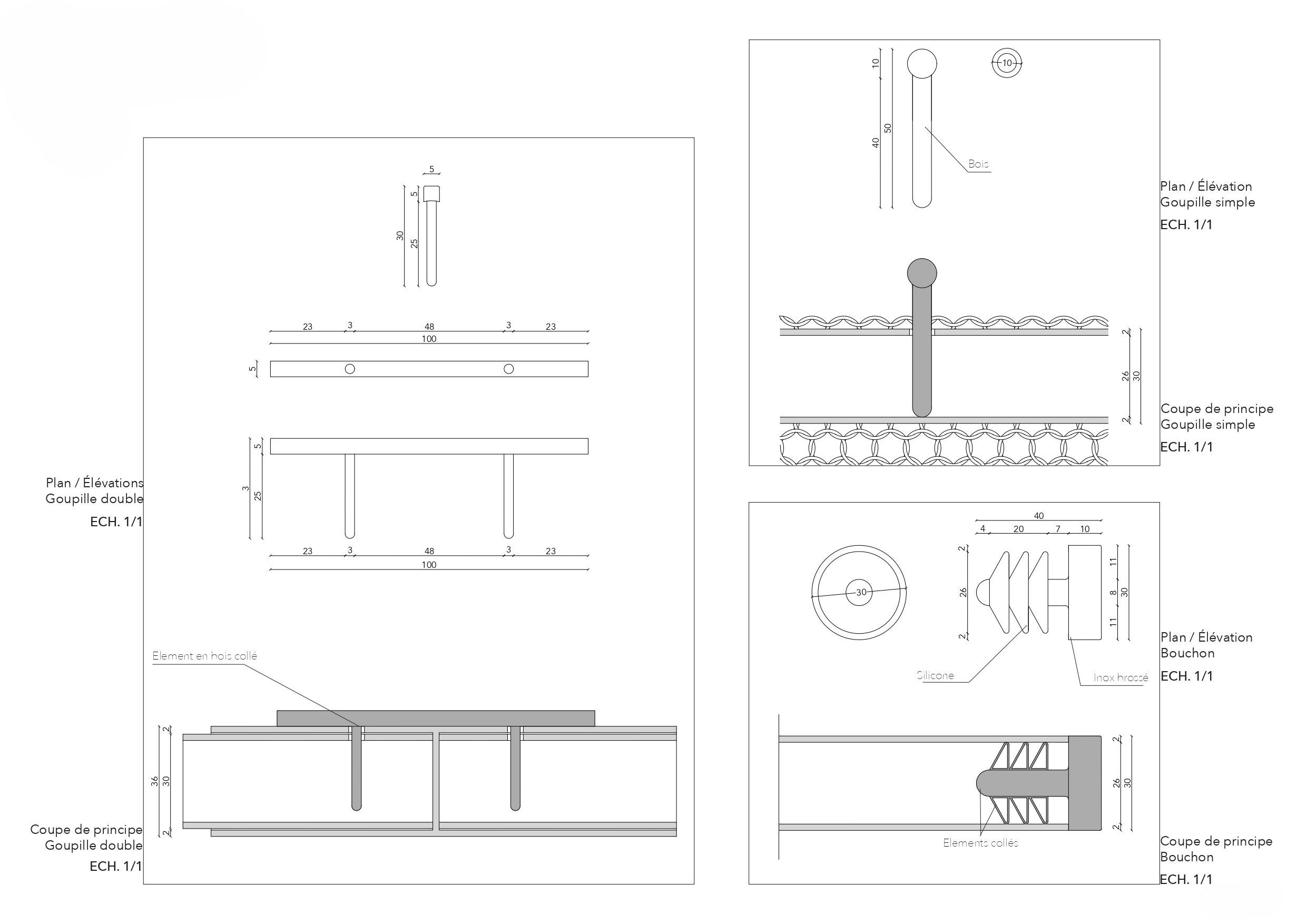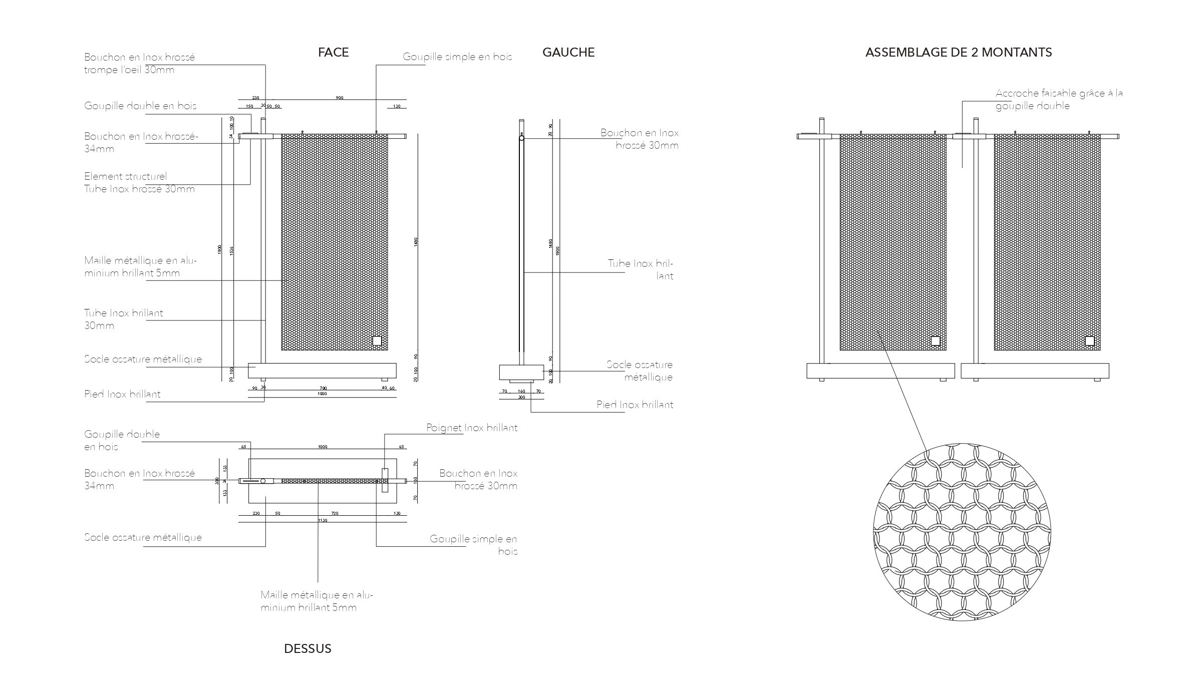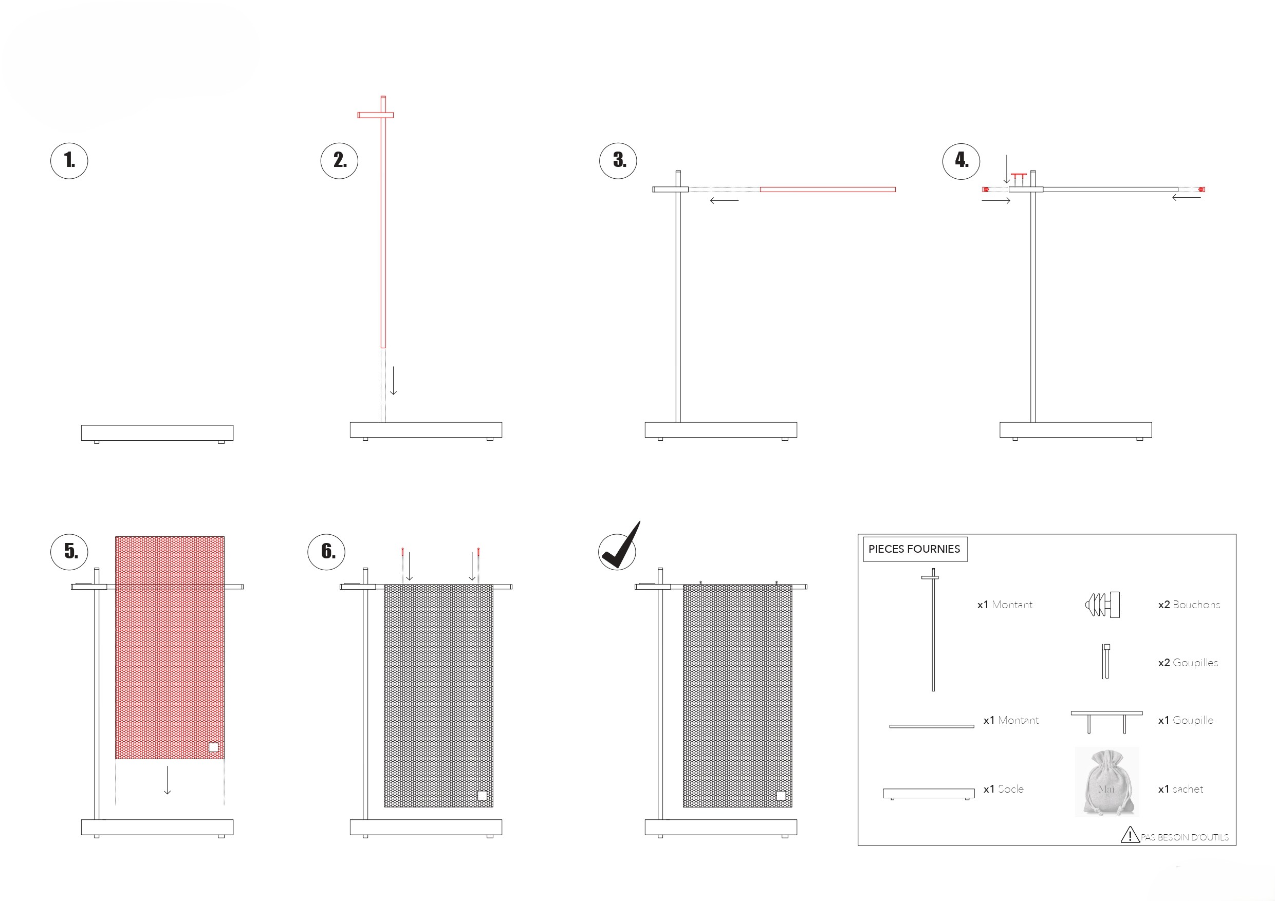 La structure est entièrement démontable et facile à remonter. Elle est aussi modulable : plusieurs éléments identiques peuvent être assemblés grâce à un système de tubes et de goupilles, permettant une mise en place adaptable selon les besoins.